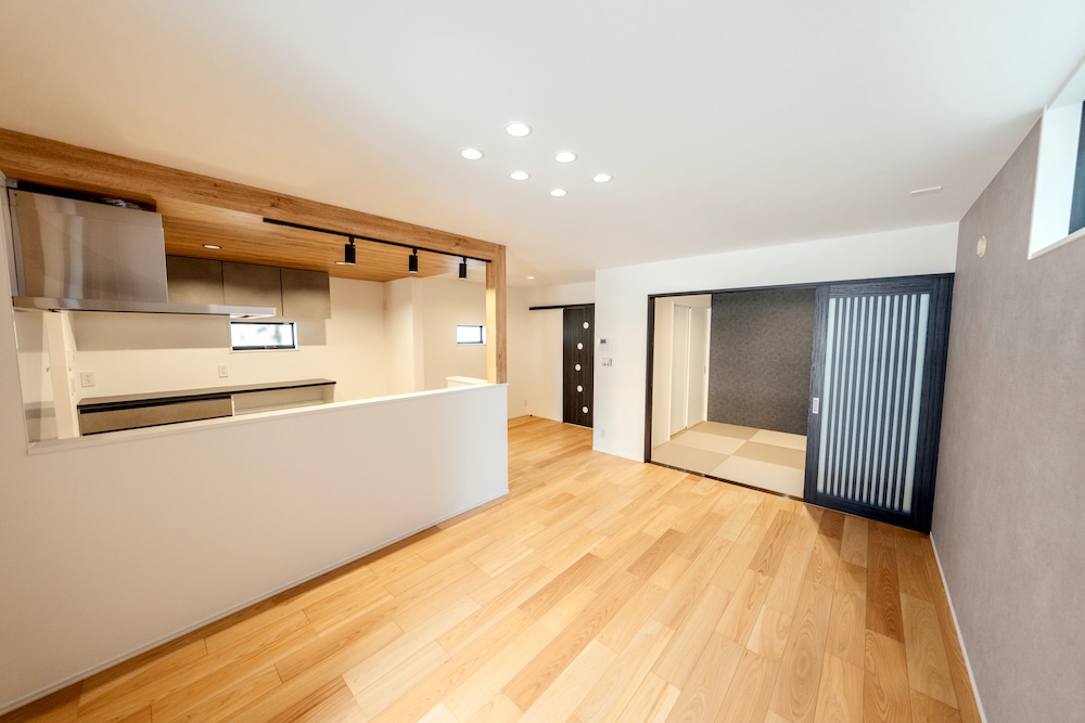 リビングはダウンライトを採用し、落ち着いた雰囲気を演出。横には日本らしさを感じられる和室を配置し、くつろぎや来客時にも活躍します。