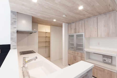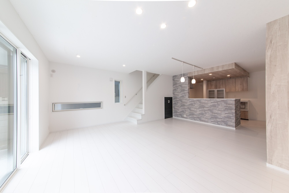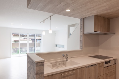 その中山エリアに完成した新築戸建は、広々とした22.7畳のLDKが魅力。大きな窓から光が差し込み、明るく開放的な空間を演出しています。キッチンはシステムキッチンとお揃いのカップボードやパントリーを備え、収納力抜群です。キッチン周りの壁もおしゃれで良いアクセントになっています。