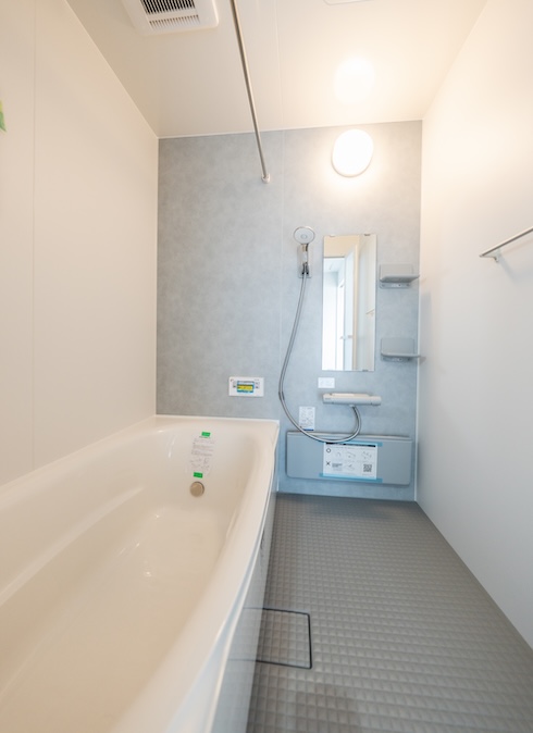 浴室もLIXIL製で、パネルは磁石式のため棚の配置が自由自在。桶台も折りたたみ収納や取り外しが可能で、お手入れのしやすさに配慮しています。